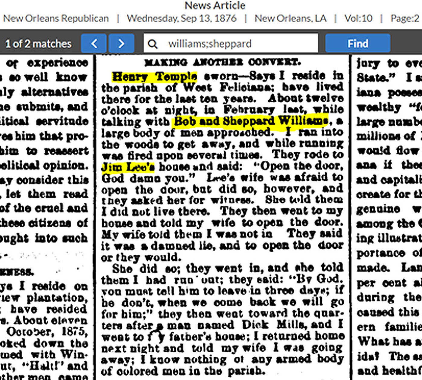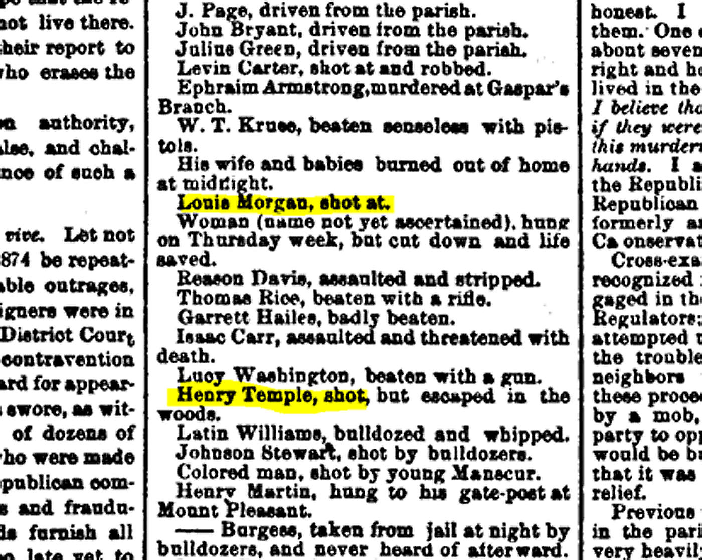 Thanks to the excellent sleuthing of my cousin Shawn Taylor, I was able to find evidence that these intimidation tactics hit home. On Nov 11, 2020, Shawn alerted me of the following gem she found on GenealogyBank.comthat mentions our 3rd & 4th great-grandfathers, Sheppard and Bob Williams, respectively, as well as Jim Lee, Bob’s son-in-law. They were witnesses to a large group of men, known as “Regulators” and “White Leaguers” hunting down a man named Henry Temple (also believed to be a relative), a member of the police jury in Laurel Hill, Louisiana (West Feliciana Parish).