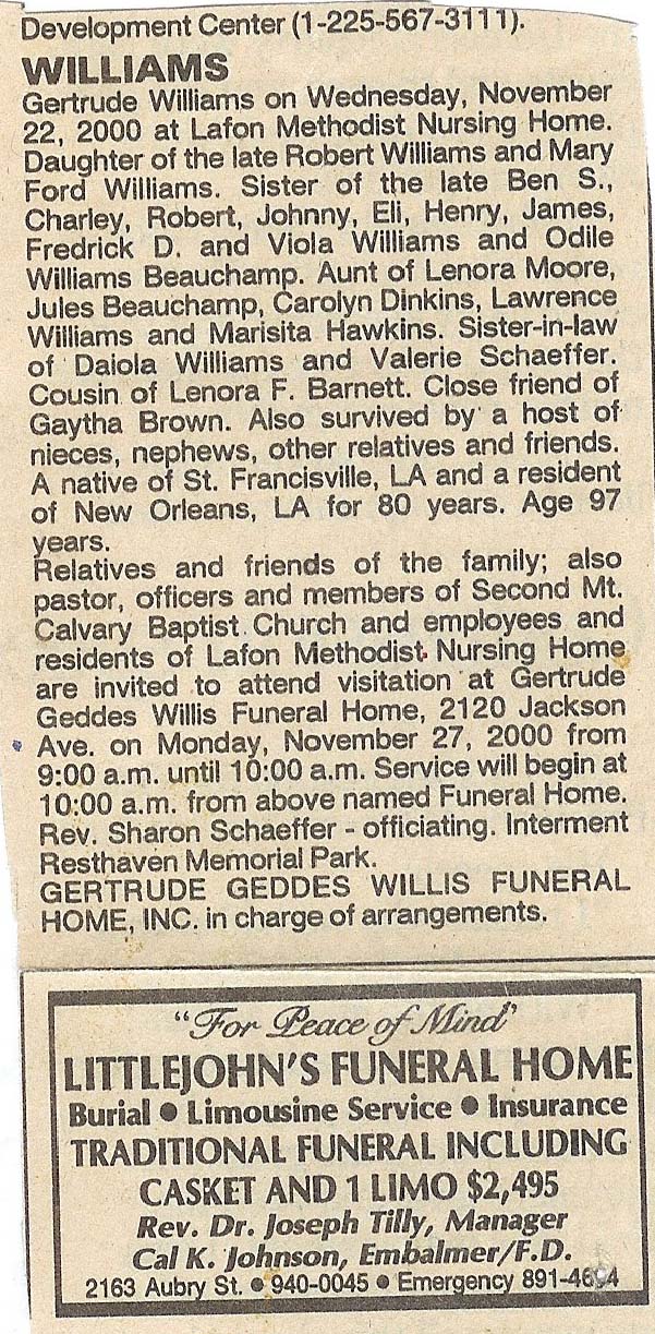 Before she died, Dorothy, Yolanda’s mother, told her that she found out at a young age that her real father’s name was Robert Williams. He was an older man when Dorothy was born. Unfortunately, she only met him a few times before he died and she did not know much about him other than the fact that she had older half-siblings from his previous marriage. After her mother’s death, Yolanda was doubtful she would learn anymore details about the life of Robert Williams, however when she read my blog, she recognized many names I mentioned in the Williams family. Dorothy had an older half-sister named Gertrude Williams, a person mentioned in my blog, that passed away in 2000. Dorothy had a copy of the newspaper death notice from the New Orleans Times Picayune. Yolanda, compared the names with my blog and noticed many similarities. At that moment, she believed she was related to Elodie and I.