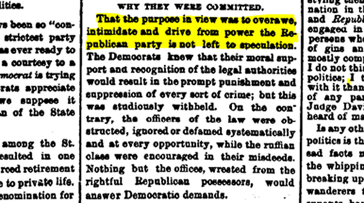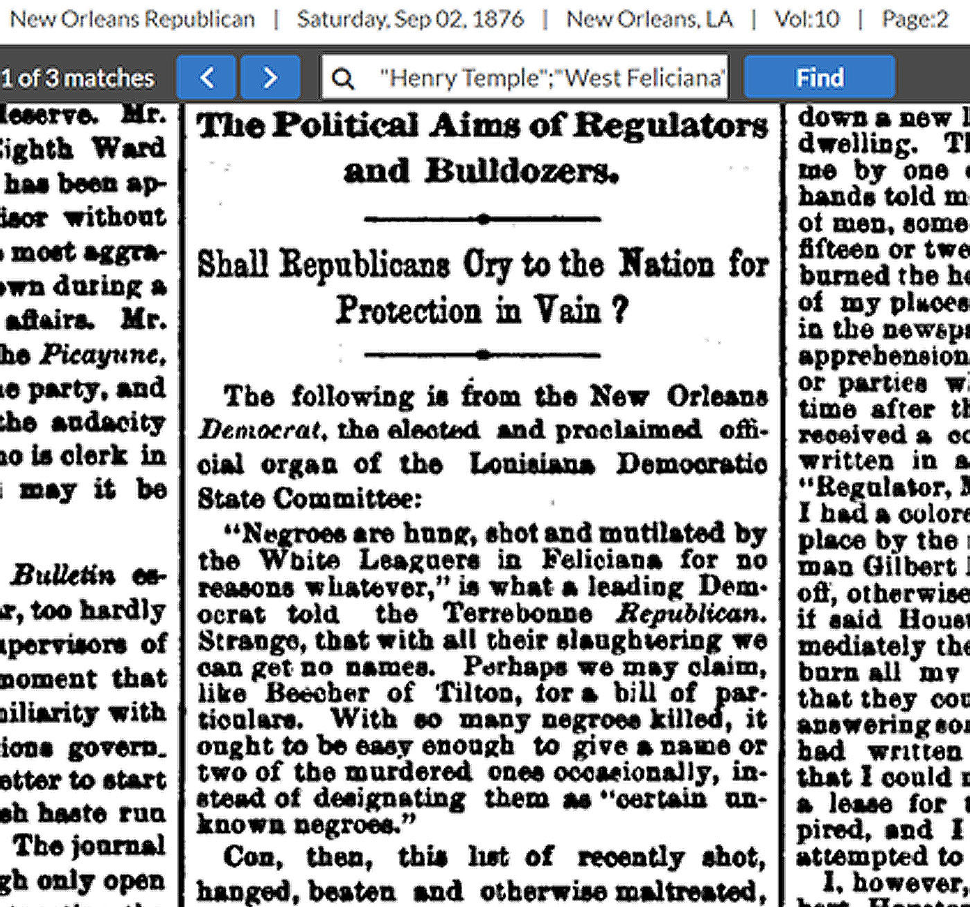Ten months later, the New Orleans Republic publishes a report from the New Orleans Democrat detailing the names of the black victims terrorized by the White Leaguers in West Feliciana Parish: