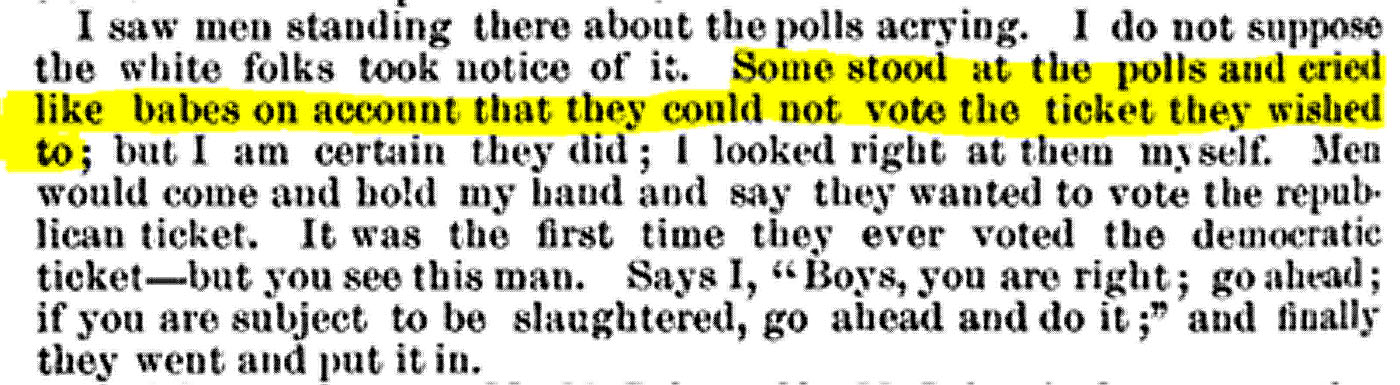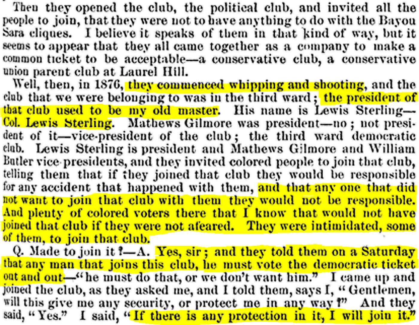 As Shawn and I continued to search these historical newspaper articles throughout the night, my curiosity got the better of me, so I decided to check the “Report of Committees of the Senate of the United States for the 2nd Session of the 44th Congress, 1876-77” on Google Books. I told Shawn that there must be court testimonies of these events because the newspaper articles referenced them. Report No. 701 on Louisiana in 1876 (Vol. 3) entitled the “Reportof the Sub-Committee of the Committee on Privileges and Elections of the UnitedStates Senate,” contains hundreds of testimonies from individuals within the community familiar with the events in question. I found several references to my family members and even their personal accounts. It is not only evident that many African Americans in the parish were intimidated into switching their votes to the democratic ticket, but also that witness tampering and intimation occurred. Many of the black citizens were scared to tell the truth about what they witnessed, heard and experienced; many of their testimonies conflicted with one another and many of them denied observing any acts of violence or intimidation. In some cases, some of them stated they, and everyone they knew, voted the democratic ticket of their own free will which was clearly not true.