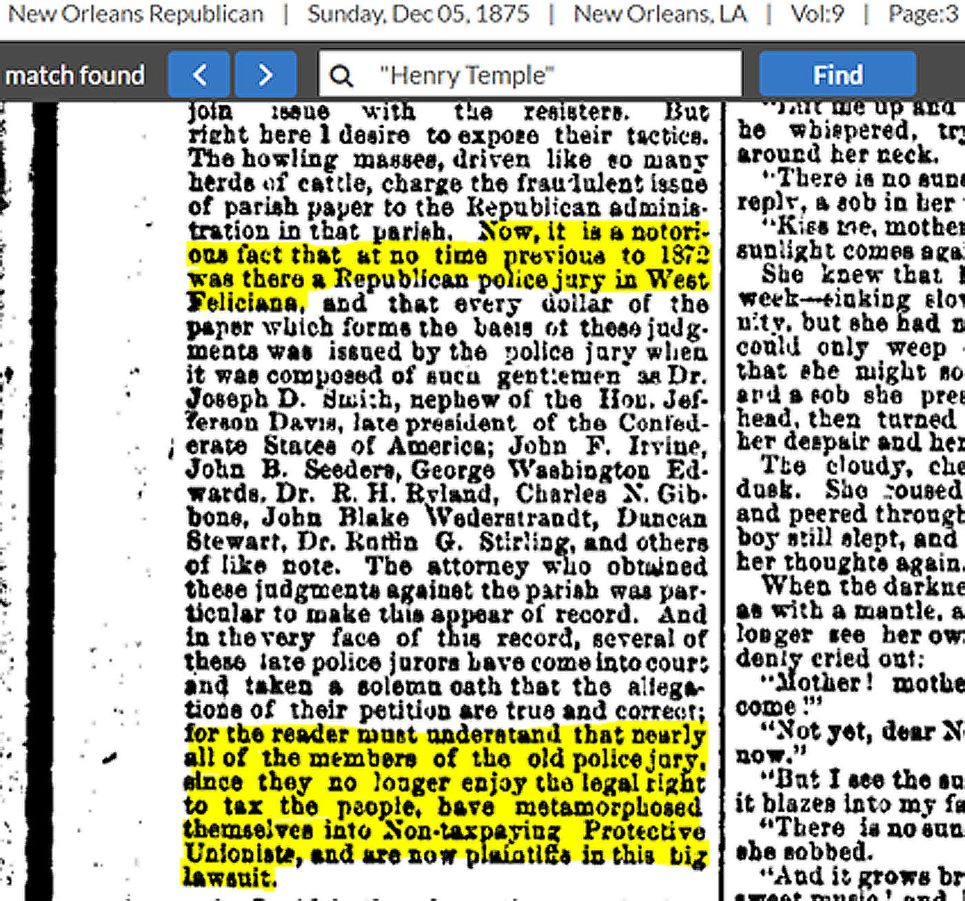 Why the vitriol and violence? What did Henry Temple do? It turns out that since the police jury was under republican control as early as 1872, they began to levy taxes upon the local white citizens who rebuffed the judgements; they even went as far as calling them “illegal” and “fraudulent.” However, in the not-so-distant past, this police jury, when controlled by white democrats, levied similar taxes as this newspaper article from the New Orleans Republic illustrates:
