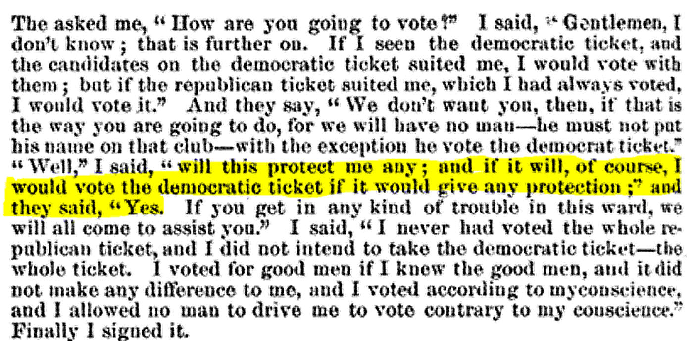 These “Non-taxpaying Unionist” created an organization known as the “Taxpayers Protective Union” designed to fight these judgements, but their methods show that their organization was really a front for the White Leaguers to actively engage in violence, voter intimidation tactics, and use local government issues to justify their actions. Consequently, their tactics worked–forcing all the black police jurors to resign, so the White Leaguers could appoint their own.