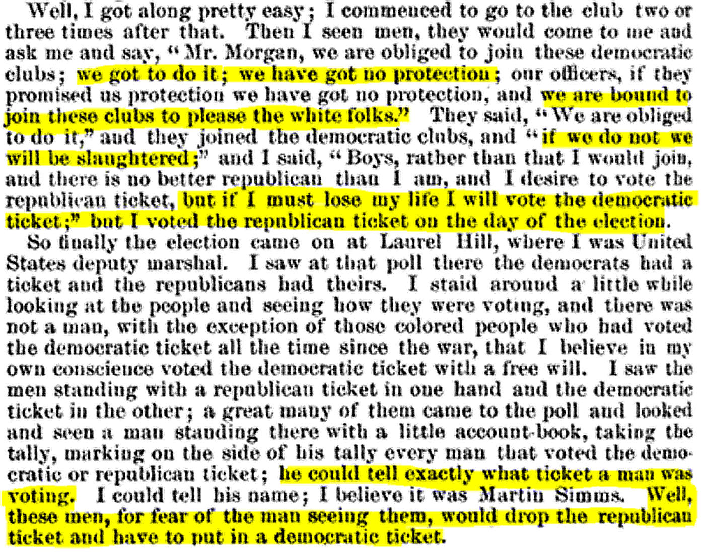 There were others who seemed to have little to no fear about telling the truth such as my 3rdgreat-grandmother’s brother, James Morgan who provided testimony in New Orleans on January 13, 1877. His testimony really gave me a sense of the pressure these black citizens were under, and the sentiment of those who, although they were loyal to the “party that gave them their liberty,” realized that survival was the highest priority: